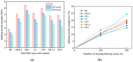The splitting tensile strength loss of CGAC with different types and content of steel fibers after F-T is presented in Figure 6. Similar to the compressive strength loss, the splitting tensile strength loss of steel-fiber-reinforced CGAC and the reference group R0 were approximately the same after 250 F-T cycles, ranging from 9% to 13%. After 500 F-T cycles, when the steel fiber content was lower than 1 vol.%, the splitting tensile strength loss of CGAC decreased with the increase of steel fiber content; and it reached the lowest value of 16.4% when the steel fiber content was 1 vol.%. When the fiber content exceeded 1 vol.%, the splitting tensile strength loss of CGAC increased accordingly, and it reached 24.4% when the fiber content was 2 vol.%. This is because when the steel fiber content is lower than 1 vol.%, most of the fibers can bond well with the cement matrix. When the specimens were subjected to splitting tension, frost damage occurs inside the concrete, but incorporating an appropriate amount of steel fibers has a positive effect on dispersing the stress concentration at the trailing edge of cracks, withstanding tension, and slowing down the cracking development inside the CGAC specimens [42]. Similar to the compressive strength loss test, with more fibers added, it was difficult for them to be mixed evenly, and even agglomeration appeared, which caused a worse bonding performance between concrete and steel fibers and increased the splitting tensile strength loss of CGAC.