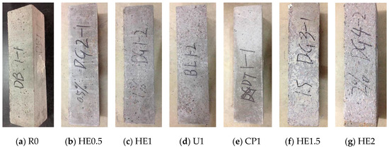 Figure 8 shows the surface spalling of concrete after 100 F-T cycles. As can be seen from this Figure, the anti-spalling performance of CGAC without steel fiber is better than that of fiber-reinforced CGAC. With the increase of HESF content, the influence of the steel fiber on mass loss of CGAC became more significant. However, it took at least 500 F-T cycles, which is more than the 300 F-T cycles stipulated by Chinese code, before the surface spalling became obvious [38]. Compared with the other three fiber types, 0.5 vol.% HESF distributed uniformly in concrete and bonded effectively with the paste, thus delaying the surface spalling of concrete. The mass loss of CGAC with 1 vol.%, 1.5 vol.%, and 2 vol.% steel fiber were very close, which indicates that the effect of increasing steel fiber content is limited, instead, the construction cost increases. For CGAC with the same steel fiber content, the surface spalling of CGAC with 1 vol.% USF was much more serious than that of the other two kinds of concrete, while the mass loss of CGAC with CPSF was the largest. This is consistent with the mass loss test results of CGAC in this study, as presented in Figure 7.