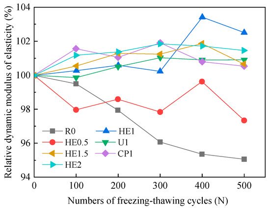 For different types of steel fibers, it can be seen from Figure 9 that the RDME of the three kinds of steel-fiber-reinforced concrete with 1 vol.% steel fiber are very close after 500 F-T cycles, and it is higher than that of the ordinary CGAC. This indicates that the bond force, including chemical bond action and the mechanical interlocking of the steel fiber and concrete, can partially bear the internal stress of concrete caused by frost heaving and delay the development of microcracks in CGAC after F-T cycles.