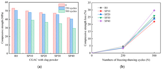 (a) Compressive strength and (b) compressive strength loss of CGAC with different slag powder content after F-T cycles.