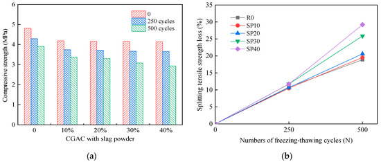 Figure 11 presents the splitting tensile strength of CGAC with different cement substitution rates after F-T cycles. Similar to the compressive strength shown in Figure 10, the splitting tensile strength loss of CGAC specimens grew with the increase of F-T cycles and slag powder content. By the end of 250 F-T cycles, the effect of slag powder content on splitting tensile strength loss of CGAC was almost the same. After 500 F-T cycles, the differences of splitting tensile strength loss became more remarkable. The splitting tensile strength loss of SP10 was 19.5%, and that of SP40 was 29.1%. The splitting tensile strength loss of the ordinary CGAC was relatively small. Therefore, the slag powder was not conducive to reducing the mechanical strength loss of CGAC when it experienced F-T cycles. This may be because after partially replacing cement with slag powder, the hydration products of cement reduced. Besides, the slag powder was not fully activated at an early age, resulting in less hydration products filling the concrete pores and reducing the frost resistance of concrete [44].