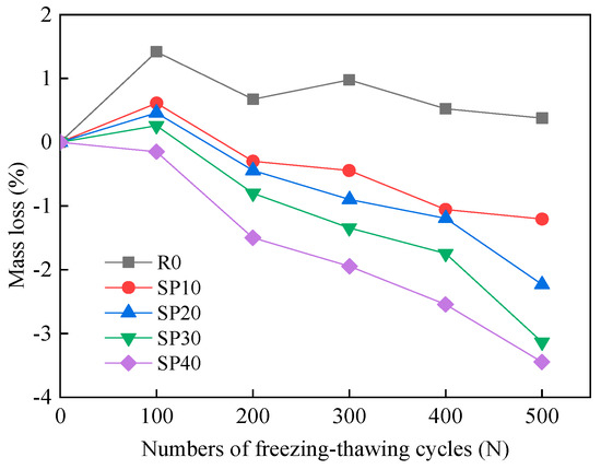 Figure 12 presents the mass loss of CGAC with different slag powder content after 500 F-T cycles. It is apparent from the Figure that the mass loss of CGAC increased significantly when the cement substitution rate grew, which means the frost resistance of CGAC decreased with the increased substitution rate. However, the mass loss of SP40 was only 1.95% after 300 F-T cycles, and it reached 3.45% after 500 F-T cycles. However, it was still lower than the limit value (5% mass loss) proposed by the Chinese code GB/T 50082-2009 [38].
