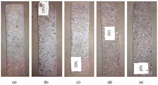 Figure 13 confirms the effect of slag powder content on surface damage of CGAC after 500 F-T cycles. It is obvious that the surface peeling of CGAC with a 40% cement substitution rate was the most serious, which corroborated the mass loss test results. The mass change of ordinary CGAC without slag powder was not significant after 500 F-T cycles. Therefore, the frost resistance of ordinary CGAC cannot be accurately evaluated by the mass loss.
