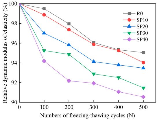 The effect of slag powder content on RDME of CGAC is shown in Figure 14. In this Figure there is a clear trend that the RDME of CGAC decreased gradually with the increased cement substitution rate after F-T cycles. The RDME of SP10 was close to that of the ordinary CGAC. When the cement substitution rate reached 40%, its effect on frost resistance of CGAC was the most significant, and the RDME decreased the most. However, the dynamic elastic modulus was still more than 90.5% of its original value even after 500 freeze-thaw cycles. That is, the substitution of slag powder for cement did not reduce the frost resistance of concrete very much, which is consistent with the strength loss and mass loss test results.