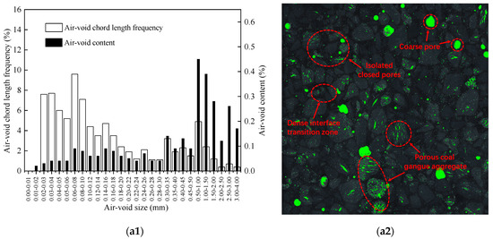 Air-void characteristics have a big impact on frost resistance of CGAC [39]. The air-void parameters of CGAC, such as air content, the quantity of voids, mean chord length, specific surface, and spacing factor were graphically examined by using an air void analyzer (Rapid Air 457, Denmark) as shown in Figure 4a.