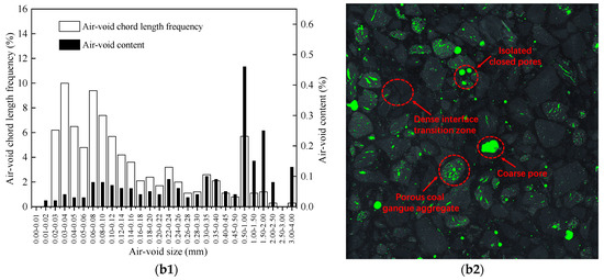 Air-void distribution and cross-sectional morphology of CGAC with (a) 10% cement substitution rate; (b) 40% cement substitution rate (1: Air-void distribution; 2: Cross-sectional morphology).