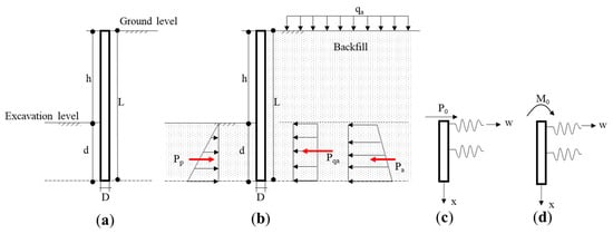 The cross-section of a simple cantilever soldier pile wall is given in Figure 1a. In Figure 1a, the symbols h, d, L, and D represent the excavation depth, embedment depth, and total length of the pile and the diameter of the pile, respectively. The stability of soldier pile walls relies upon the mobilization of earth pressures on both sides of the wall stem [8,9]. Active and passive stresses which are generated according to this earth pressures are shown in Figure 1b according to the beam on elastic soil assumption. Rankine Earth Pressure Theory is used to calculate lateral earth coefficients. qa describes the external load that is affecting the soldier pile at the active side of the wall. qa is converted to lateral load (Pqa) by the use of active lateral earth coefficient of natural soil conditions. Pa and Pp define the lateral soil reaction forces of the active and passive side, respectively.