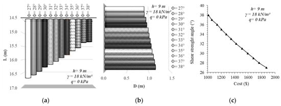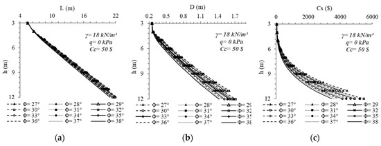 In Figure 3, the effects of the change of soil strength angle are shown for a specific reference case. The shear strength angle is changed between 27° and 38° to represent the sand formation’s relative density beginning from a loose to a dense state. The depth of excavation is assumed to be constant (h = 9 m). The surcharge load application is not taken into consideration, and the unit weight of the soil is assumed to be 18 kN/m3. Figure 3a represents the change of pile length, Figure 3b shows the change of pile diameter, and Figure 3c represents the cost change. The increase of the shear strength angle is directly proportional to the increase of soil strength. Therefore, the rise of the shear strength angle straightens the length of the pile and embedment depth. The relative decrease of pile length is approximately 9% in such a case that the shear strength angle increases from 27° to 38°. Then, the relative decrease of pile diameter is approximately 25% in such a case that the shear strength angle increases from 27° to 38°. Therefore, it can be said that the increase of soil the shear strength angle affects the pile diameter more than the length of the pile. However, in geotechnical applications, generally, a standard diameter is preferred to be used in order to reduce the equipment cost. That’s why if the pile diameter is selected as a constant value for all the excavation depths, the length of the pile will be directly affected by this change more than the change of the internal friction angle. The cost of the unit pile is influenced from the change of the shear strength angle directly. The rise of the strength of the soil leads to decreasing the costs by approximately 46%. In such a case that the soil 44shear strength angle increases from 38° from 27°, the cost of the construction has decreased to $1010 from $1873.