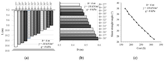 The change of soil shear strength angle is also evaluated according to the change of excavation length. Figure 5 is illustrated to understand the change of pile length (a), pile diameter (b), and unit pile cost (c), respectively. It can be directly seen from the comparison of Figure 5a,b that the change of shear strength angle has a greater effect on the pile diameter than the pile length, especially for deeper excavations. This condition causes encountering unexpected pile lengths for deep excavation projects. In Figure 5, the main dimension change begins to occur at the depth of 5 m. In the context of this study, according to the worked parameters, it can be a general approach that 5 m excavation depth is assumed to be a limit length of the change of the design. It is a noticeable point that for loose sands that have a shear strength angle between 27° and 30° according to Bowles [14], the optimization analysis can’t find an appropriate cross-section, which is ensuring both geotechnical and structural design requirements. For this reason, approximately 10 m depth can be assumed to be the upper bound of the applicable excavation with the construction of cantilever soldier piles.