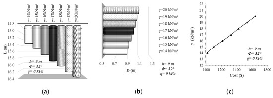 The change of the unit weight of the soil profile is also investigated within the context of present study. Figure 6 is drawn for 9 m excavation depth to reflect the effect of soil unit weight on the dimension and cost change of the pile. The shear strength angle of the surrounding soil is assumed to be 32°, and surcharge load is not applied. Then, the unit weight of the soil is increased beginning from 14 kN/m3 to reach 20 kN/m3 one by one. Figure 6a shows that the increase ratio of the pile length is approximately 7% for a 6 kN/m3 increase of unit weight. The increase of unit weight of soil leads to widening the pile diameter by nearly 22%. This condition is based on the computation equations of both active and passive lateral forces. The unit weight is the direct multiplier of these equations. The increase of unit weight affects passive lateral forces more than active lateral forces due to the relative difference between active and passive lateral earth coefficients. Active lateral earth pressure is determined by the Rankine Active Earth Pressure Theory with the Ka = tan2 (45 − Φ/2) equation, and passive lateral earth pressure is calculated by Rankine Passive Earth Pressure Theory with Kp = tan2 (45 + Φ/2). The difference of coefficients is directly related to the shear strength angle. However, the shear strength angle is not a direct multiplier of lateral forces. Therefore, it can be said that the change of the unit weight of the soil influences the unit cost of pile more than the change of shear strength angle for the fictionalized cases of this study within the selected parameter limits. The change in the unit cost of the pile can be calculated to be approximately 66% from Figure 6c. In such a case that the unit weight of soil increases to 20 from 14 kN/m3, the cost of the construction has increased to $1642 from $1017.