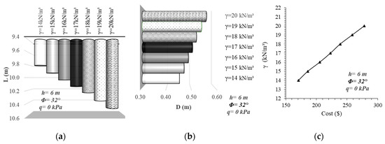 The effects of the change of soil unit weight to the diameter of the cantilever soldier pile (a), the length (b), and the unit cost of pile (c) (for h = 6 m excavation depth).