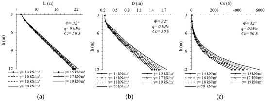 The effects of the change of soil unit weight to the diameter of the cantilever soldier pile (a), the length (b), and the unit cost of pile (c) (for h = 6 m excavation depth) via the excavation depth.