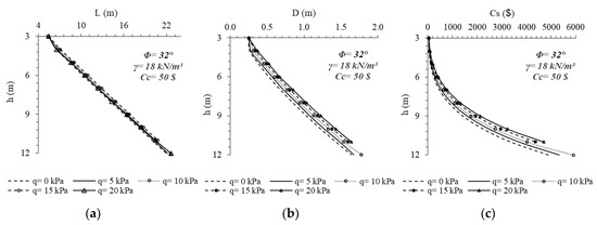 In this case, the length of the pile is raised 8%, the pile diameter is increased 28%, and the unit cost is increased 77% due to the increase of external load to 20 kPa. The cost has raised to $423 from $239 with the increase of surcharge load to 20 kPa. This situation exhibits that surcharge load application is a significant parameter in the design of cantilever soldier piles, especially for shallow depths. The analyses are repeated by changing the excavation depth of 3 m, but there are no differences of the design dimensions of the pile. If only the soil is loose and the unit weight of the soil is high, an approximately 1% change of pile length happens for 3 m excavation depth. Figure 11 is drawn to show the change of design and cost of the cantilever soldier pile via the excavation depth for different loading situations. The shear strength angle of the soil is selected to be 32°, and the unit weight is assumed to be 18 kN/m3 for the reference case. It is clearly seen from the comparison of Figure 11a,b that the pile diameter is the parameter that has the most influence on the design. The increase rate of the external load does not have any significant effect on the length of the pile. Besides, for the excavation depths that are deeper than 11 m, according to the increase of external load, the optimization algorithm cannot obtain a proper design ensuring both geotechnical safety and structural adequacy.