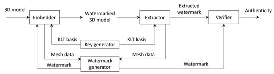 - Extractor: extracts the watermark present in a 3D model using the secret KLT basis provided by the key generator module;