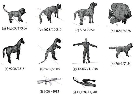 In [], the authors reported distortion (the same as our MAE values) for various settings of their method’s parameters; again, an exact comparison was difficult for two main reasons. First, the set of models they used was different from our set, and the model precision was , whereas the precision of our models was . Anyway, their best result was , which was worse than our worst result (horse, ) by one order of magnitude. In [], the same authors reported a distortion of , four orders of magnitude worse than our distortion results.