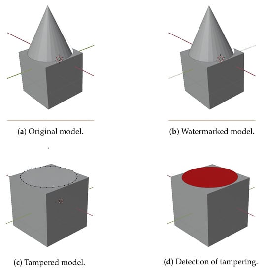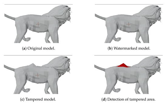 An example of tampering is shown in Figure 4c, and the resulting tamper detection highlights the modified vertices in red color, as can be seen in Figure 4d.