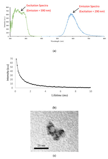 The phosphorescence spectra and decay curves of the Mn2+-doped ZnS QDs entrapped in the sol-gel were recorded upon excitation at 290 nm using RTP conditions with a delay time of 0.1 ms, a gate time of 2 ms, and slit widths set at 10 nm.