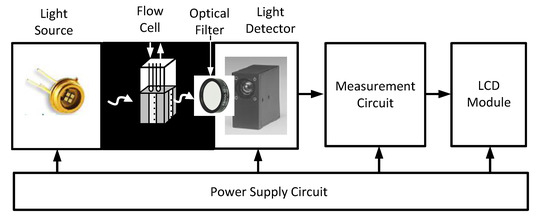 Figure 2 shows a block diagram of the proposed system. Briefly, a light source excites the optical sensor inside the flow cell. The light detector is responsible for converting the light emitted by the sensor, which is dependent on the analyte, into an electrical signal.