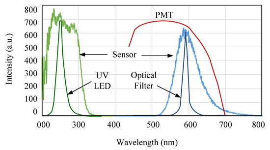 20]. For this reason, it is necessary to use an optical filter since these parasite emissions match the emission spectrum of the sensing material. Hence, to reduce these interferences, a bandpass filter centered around 550 nm was used. This filter was set on the photomultiplier tube’s (PMT) window. The light detection can be made using a PMT, avalanche photodiodes (APDs), or a Si PIN photodiode. In applications where there is a weak signal, a PMT is the best option [
