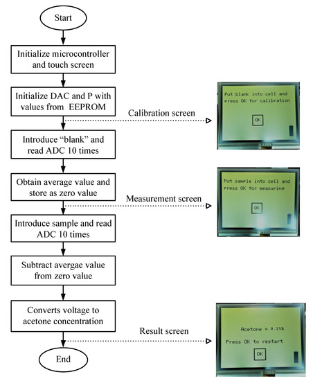 Figure 5 shows the flowchart of the microcontroller firmware and the user interface screens. The microcontroller was programmed in the C language. First, the microcontroller and the touch screen are initialized. Second, the values of the DAC and the digital potentiometer are loaded from the microcontroller. Then, the calibration screen is shown, to measure the “blank.” The ADC reads the blank 10 times, obtains the average value, and stores this value as the zero value. Next, the instrument is ready to measure the analyte and the measurement screen is shown. The ADC also reads the analyte 10 times and the average value is obtained and subtracted from the value of the “blank”. This value is converted into a concentration using the calibration curve and shown on the final screen. It is necessary to calibrate the instrument with each measurement by following the above procedure. The settings screen is accessed by pressing the battery symbol placed at the lower-right corner of the display. It is possible to change the voltage to control the gain of the PMT.