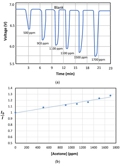 Figure 8a shows the phosphorescent response of the sensing phase to increasing the acetone concentrations in the air gas flow. This figure was obtained at the output of the PMT. The optimal synthetic air gas flow, providing a higher quenching effect for a given acetone concentration, was found to be 250 mL min