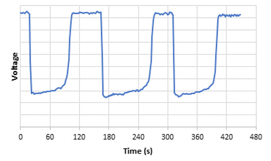 Figure 9). As can be seen, after a fast decrease of the phosphorescence signal once the gaseous acetone arrived in the sensing phase, there was a small drift of the signal that was most probably caused by signal stabilization and kinetics of the interaction between acetone and the sol-gel doped with the QDs, as well as the beginning of the recovery of the signal as the acetone concentration in the airflow started to decrease according to an exponential dilution curve. Once the acetone concentration in the airstream was reduced, the phosphorescence signal completely recovered to the original one.