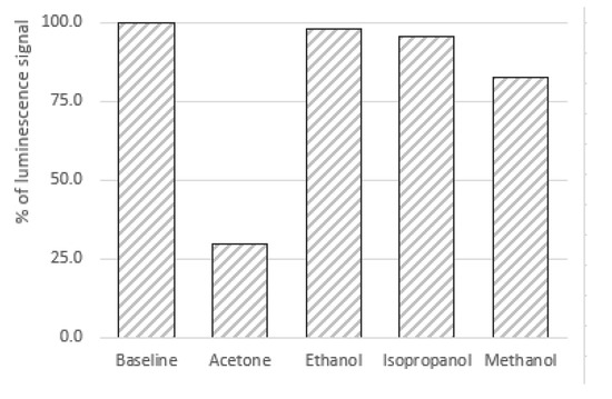 Species that could potentially interfere with the sensing phase were evaluated by injecting controlled amounts of methanol, ethanol, and isopropyl alcohol gaseous solutions into the three-necked flask, analogous to the acetone sensing procedure. To do that, 100 µL acetone was injected in the 500 mL exponential dilution system to prepare an air sample containing a concentration equal to 157 ppm. Additionally, 500 µL of the assayed species and possible interferents were injected consecutively to ensure concentrations in the air phase of 781 ppm isopropyl alcohol, 757 ppm methanol, and 789 ppm ethanol. Such air samples were analyzed using the sensing system and the phosphorescence signal from the sensing material was monitored in each case. The results showed that the ethanol and isopropyl alcohol caused little or no interference (no significant changes in the phosphorescence emission from the sensing material were observed) at the assayed concentration levels. However, the presence of methanol in the air sample affected the determination of acetone. In fact, an analysis of an air sample containing a 757 ppm concentration of methanol resulted in a decrease of the luminescent analytical signal equivalent to 17% of the one produced by the presence of a 157 ppm acetone concentration. For similar concentration levels of acetone and methanol in the gaseous air sample, the effect of methanol was less than 5% of that produced by acetone. The relative effect of the tested interferents on the luminescence signal of the sensing material is presented in