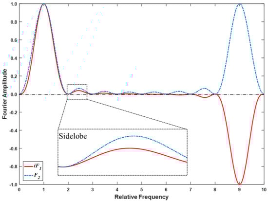 Figure 5 presents the sampling functions iF1 and F2 of Surrel’s 2N − 1 algorithm. As mentioned above, this algorithm can compensate for not only the phase shift miscalibration but also the coupling error. However, the sidelobe still exists, with a value around 5.5883%. A high sidelobe amplitude indicates significant vulnerability to the adjacent signal. Therefore, this algorithm is not appropriate for measuring a highly reflective sample.