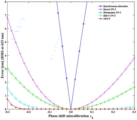 Research was done by de Groot and Hibino on the error analysis within the consideration of the coupling error [46,47]. In phase-shifting interferometry, de Groot found that the measurement accuracy can be influenced by harmonics, phase shift errors, or a combination of both. He derived a kind of analytical formula in order to check the ability to suppress both the phase shift errors and the coupling errors. Therefore, the RMS (Root Mean Square) phase error resulting from phase shift miscalibration is described as follows