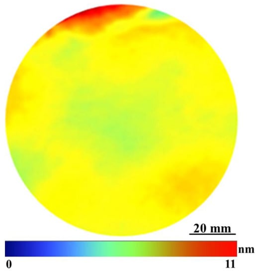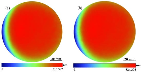 The calculated surface profiles by phase unwrapping [51] are given in Figure 10, which presents the entire configuration of the silicon wafer. All 20 experiments were conducted successively within three days. To test the reliability of the proposed algorithm, the sample was measured using a FUJINON interferometer (G102, FUJIFILM Corporation). By using proposed new method, the obtained average peak-to-valley (PV) value of 20 experiments was 513.587 nm (Figure 10a), and the standard deviation of 20 experiments was 2.05 nm. By using FUJINON interferometer, the obtained average peak-to-valley value was 524.376 nm (Figure 10b), and the standard deviation was 2.33 nm. The error map of the surface shape is shown in Figure 11. Table 2 shows the peak-to-valley and RMS values of the 10N − 9 method and the FUJINON interferometer, respectively.