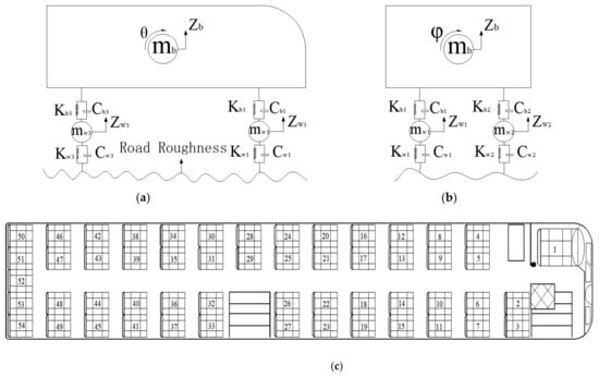 The bus model is comprised of five rigid bodies, i.e., one for the bus body and four for the four wheels, as shown in Figure 1. The bus body is assigned three degrees of freedom with respect to its gravity center: the vertical displacement (Zb), the rotation about the width-axis (pitch angle θ), and the rotation about the length-axis (roll angle ). Each wheel as one rigid body is assigned one degree in the vertical displacement (). There are 7 DOF in total for the bus [14,15]. In order to consider the spatial effect of passengers on the bus, a refined bus body model with seat arrangement is created, as shown in Figure 1c, which is applicable to study the response of passengers in different locations on the bus. The human body is connected to the bus body using the spring-damper system. It is worth to note that the road surface roughness is the main source for the vehicle vibration in the human–bus–road vibration. Therefore, the flexibility of the bus body and the engine vibration is not considered in this study, although they are also factors affecting passenger comfort.