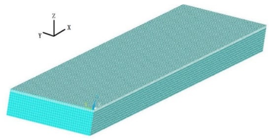 The asphalt road model is established according to the layered method. For the asphalt road with large thickness and high modulus of elasticity, the surface layer, base, and subbase can be regarded as linear elasticity, and the stress–strain relationship meets Hooke’s law. The soil foundation is regarded as an elastoplastic body, and its stress–strain relationship follows the Drucker–Prager criterion. Since the elastic modulus of the surface layer, base, and subbase are close, the interlayer contact can be considered as flexible–flexible contact. Assuming that the elastic modulus of the subbase is much higher than that of the soil foundation, the contact between the subbase and the soil foundation can be considered as rigid–flexible contact. Each layer is simulated with the Solid186 element in the ANSYS program. The contact between layers is simulated using a pair of contact elements, i.e., Targe170 (3D) and Conta173 (3D), where the surface with larger stiffness is the target surface [26]. The road model consists of 162,000 elements and 178,006 nodes. The boundary conditions of the road are determined by Saint-Venant’s principle. The nodes of the road model are symmetrically constrained in X and Y directions, and the nodes on the bottom surface of the soil foundation are fixed. The finite element model of the asphalt road is shown in Figure 4. The structural parameters of the asphalt road are shown in Table 2.