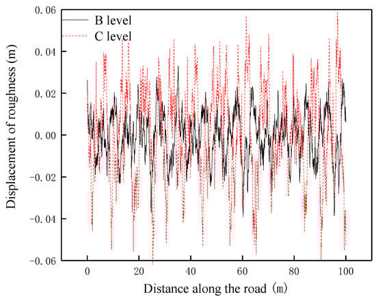 The road surface roughness is classified into eight levels, i.e., A–H [27]. B and C levels are the most common road surface conditions, accounting for a large proportion. For demonstration, the road surface roughness of a 100-m road in B and C levels is generated with a sampling distance of 0.05, as shown in Figure 5.