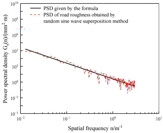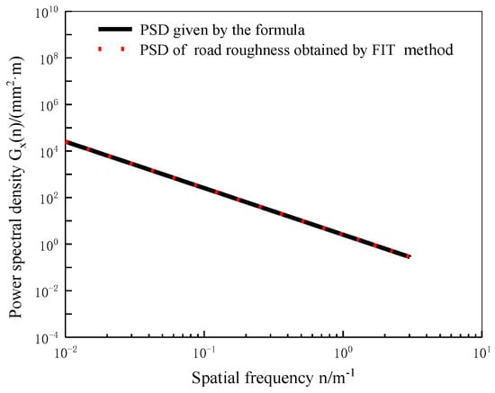 The PSD of road surface roughness is obtained using the FIT method, as shown in Figure 6. Meanwhile, the PSD using the random sine wave superposition method is also obtained, as shown in Figure 7. It is found that the PSD obtained from the random sine wave superposition method has a large error, especially at high frequencies, while the PSD obtained from the FIT method is consistent with the value calculated from Equation (4).