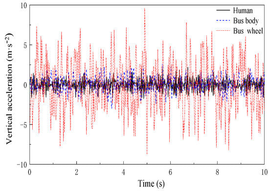 Figure 9 is the vertical acceleration time-history curves of the wheel, the bus body, and the human body in the case of B-level road surface roughness. It can be seen that the vertical acceleration amplitude of the wheel is the largest, the bus body is the second, and the human body is the smallest. The values are 9.662, 3.006, and 0.9966 m/s2, respectively. Compared with the acceleration amplitude of the wheel, the acceleration amplitudes of the bus body and the human body were reduced by 68.89% and 89.68%, respectively, which is due to the spring-damping systems between the wheel and the bus body, and between the bus body and the human body. The spring-damping system is beneficial to the improvement of passenger comfort.