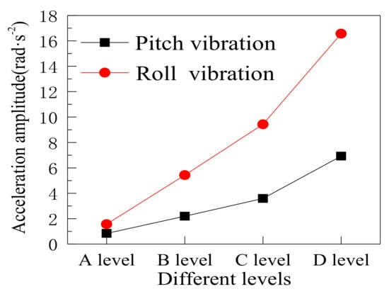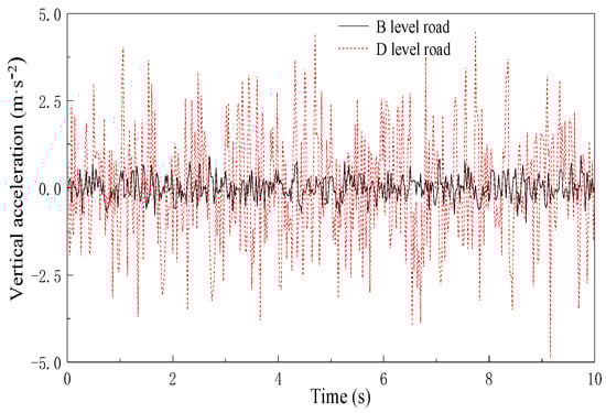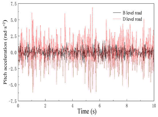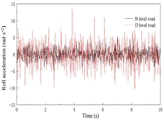 Figure 10, Figure 11 and Figure 12 show the time-history curves of the vertical, pitch, and roll accelerations of the human body under B- and D-level road surface roughness. Figure 13 and Figure 14 show the maximum acceleration amplitude of the A-, B-, C-, and D-level road surface conditions.