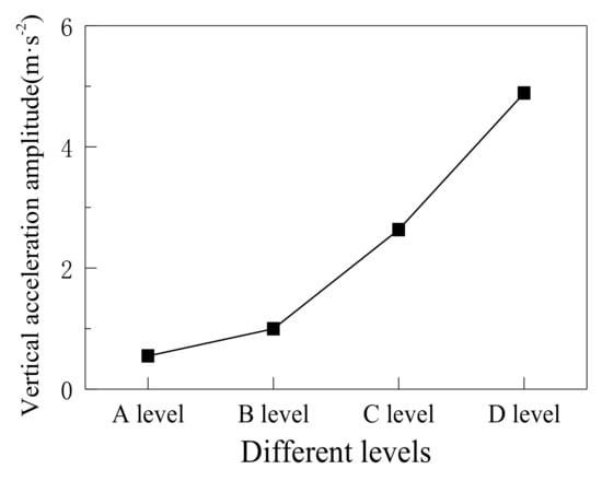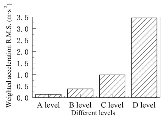 A numerical study was conducted to investigate human comfort under different road levels. Road surface roughness is the main excitation of human–bus–road coupled vibration, which has a great impact on human comfort. The parameters of the numerical example: the road is a two-way highway with six lanes, the interlayer friction coefficient of the asphalt pavement is 0.5, the bus speed is 36 km/h, and the weight of the bus is 15.89 t. The influence of four road surface roughness levels, i.e., Levels A, B, C, and D on human–bus–road dynamic response is analyzed.