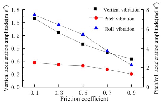 As can be seen in Figure 18, the human acceleration decreases with the increasing of interlayer friction coefficient. Compared with the case with a friction coefficient of 0.9, the vertical acceleration, pitch acceleration, and roll acceleration in the case with a friction coefficient of 0.1 are increased by 2.44, 1.88, and 3.31 times, respectively. It indicates that the influence of the interlayer bonding condition on the acceleration of the human body is obvious.