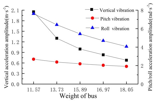 As can be seen in Figure 20 and Table 6, the vertical, roll, and pitch acceleration of the human body decrease with the increase of bus weight. When the bus weight is 18.05 t, the vertical, pitching, and roll accelerations increase by 3.03, 1.41, and 1.87 times, respectively, compared with the bus weight of 11.57 t. This shows that the load provided by the weight of the bus is mainly along the vertical direction, so the increase of the vertical acceleration of the human body is the largest, followed by the roll acceleration, and the pitch acceleration is small.
