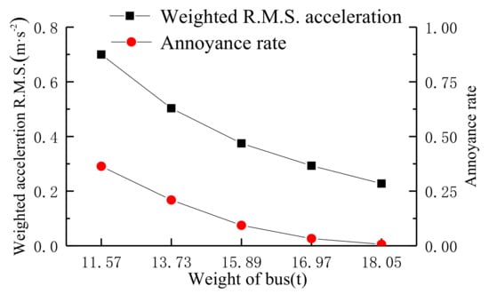 As can be seen in Figure 21, with the increase of bus weight, the weighted acceleration RMS of the human body decreases gradually, and the annoyance rate caused by the human body decreases continuously. When the weight of the bus ranges from 15.89–18.05 t, there are small changes in the values of weighted RMS acceleration and annoyance rate.