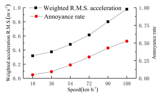 The weighted RMS of human body acceleration and annoyance rate for different bus speeds.
