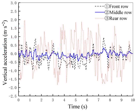 It is not reasonable to use only one value to evaluate the comfort of all passengers on the bus. In order to study the influence of the sitting position on the vibration acceleration of the human body and passenger comfort, three representative positions in the front, middle, and rear rows are selected. The vertical accelerations of the human body at the three positions are shown in Figure 24.