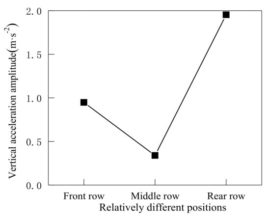 As can be seen in Figure 25, the vertical acceleration is sensitive to the sitting position. The vertical acceleration of the human body at a specific row is obtained by multiplying the pitch angle with the distance to the bus body center. The vertical acceleration amplitude of human bodies of the front, middle, and rear row are 0.9474, 0.3393, and 1.9524 m/s2, respectively. The accelerations of the front row and rear row are much greater than that of the middle row. This is because the front and rear rows are farther away from the center of the bus. Although the distance of the front row to the center of gravity of the bus is close to that of the rear row, the stiffness of the rear suspension is greater than that of the front suspension. Therefore, the vertical acceleration in the rear row is larger than that in the front row.
