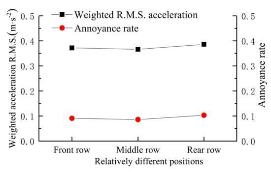 The weighted RMS of human body acceleration and annoyance rate in different positions.