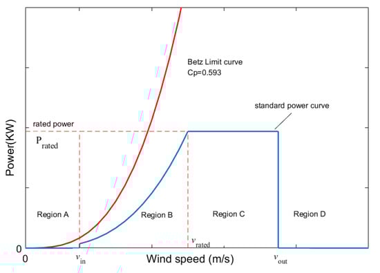 A wind turbine power curve depicts the relationship between the hub wind speed and output power, and it is an important index for evaluating the wind turbine performance. As shown in Figure 1, the power curve can be divided into four regions according to the operational features. In Region A, where the wind speed is lower than the cut-in speed , no electric power generation occurs. In Region B, the wind speed , and is rated wind speed. The maximum wind power tracking can be attained. According to Betz’s Law, the theoretical maximum utilized wind power is called the Betz theoretical limit value, the coefficient of which is 0.593. To produce maximum power, several types of control strategies are applied, such as pitch angle control, generator torque control and yaw control, to approximate the Betz curve as much as possible. In Region C, where in which the wind speed , the wind turbine remains at the rated power. As the wind speed increases, the tip speed ratio decreases more rapidly than that in the constant rotation region, and the wind turbine runs at a constant power with a smaller wind turbine power coefficient CP. In Region D, where the wind speed is faster than the cut-out speed, the pitch angle is adjusted to 90°; consequently, the turbine blades stop rotating, and wind power is no longer generated. By analyzing the operational features of the power curve, Regions B and C can be noted as the main working regions, and these regions are selected as the research objects for assessing the operation condition of a wind turbine. For convenience, Region B is called the maximum wind power tracking region (MWPTR), while Region C is called as the rated power output region (RPOR).