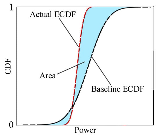 where is the mean value of power in the ith interval, is the ratio of the probabilistic area and . To explain the probabilistic area metric (PAM), the actual ECDF and baseline ECDF are shown in Figure 3. There is a contact point of two ECDF curves. The probabilistic area is cyan region of two ECDF curves, which can be calculated by the integral method in the Equation (5). It is possible that actual ECDF and baseline ECDF have no contact point. In other words, the actual ECDF is always above or under the baseline ECDF. The probabilistic area is also computed by the Equation (5).