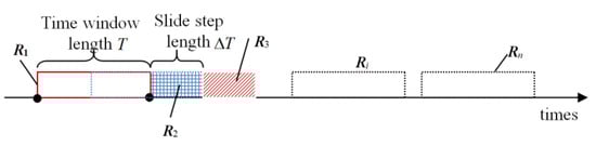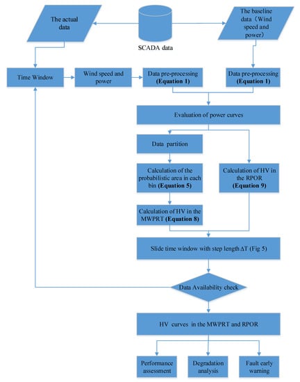 The baseline data and actual data are both divided into MWPTR and RPOR. The DBSCAN method is used to preprocess the data, in which Eps_opt is calculated using Equation (1). Next, the wind speed and power data in the MWPTR and RPOR are evaluated using the methods proposed in Section 3.3.1 and Section 3.3.2, respectively. The values of and of the wind turbine can be computed by Equations (8) and (9). After assessing the performance of the R region, the new assessment data can be obtained by sliding the windows with step ΔT. The update method of the evaluation data is shown in Figure 5. With the same calculation process, the HV of different time windows can be obtained. For SCADA data pertaining to a long duration, two time series can be acquired, which are defined as and . Later, through analysis of the time series of the HV, operations and maintenance activities, such as performance assessment, degradation analysis and early warning, fault detection, can be better performed.