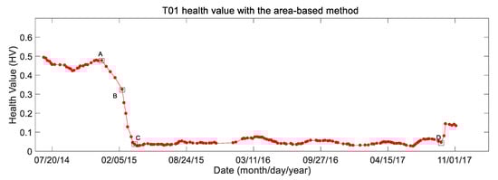 Health result of T01 obtained using the probabilistic area metric (PAM) method in the maximum wind power tracking region (MWPTR).
