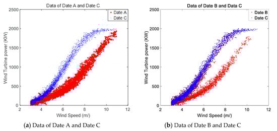 HV curve of the T01 wind turbine is calculated and given in Figure 6, it can be seen that a larger HV corresponds to poorer power performance. In addition, if two health values are farther from each other along the horizontal axis, there may be downtime. From Figure 6, it can be noted that HV is between 0.4 and 0.5 before Date A. During the time interval between Dates A and C, HV changes violently. During Dates C and D, the wind turbine operates in a stable manner, fluctuating only in a remarkably short interval with little downtime, which is consistent with the actual maintenance record. To clarify whether the HV can actually reflect the variations between the reference data and the actual data, the wind speed and power data of Dates A, B and C are plotted, as shown in Figure 7. From Figure 7a, it can be found that the deviation between Date A and Date C is extremely pronounced, and Point B indicates a transition from Date A to Date C. Therefore, the HV with the presented method accurately quantifies the power performance changes. More importantly, the gradual change of the HV is objectively presented. Further trend analysis will be meaningful for the turbine operation and maintenance activities.
