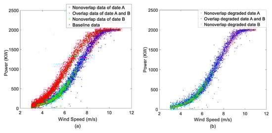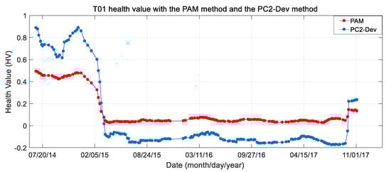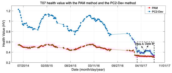 To further prove the validity of the presented method, a comparative study is performed using the PC2-Dev method []. T01 and T07 are both selected as research objects and analyzed using two different methods. The respective results are shown in Figure 8 and Figure 9, in which the blue and red lines respectively represent the results obtained using the PC2-Dev method and the PAM method. From Figure 8, two HV curves reflect the change trend of the actual power curve well; meanwhile, the inflection points in the two curves occur nearly simultaneously. In addition, in Figure 9, from March 2014 to January 2017, the two health value curves also demonstrate a similar trend. However, it must be noted that from January 2017 to September 2017, the HV curves obtained using the PAM method change slightly with the date while the HV curves obtained using the PC2-Dev method exhibit large fluctuations, demonstrating distinct differences. For analyzing the reason, two points with the largest changes in the PC2-Dev method are selected and named Date A and Date B; next, their data together with the baseline data are plotted, as shown in Figure 10. Figure 10a shows data of Dates A and B, as well as the baseline data. Figure 10b shows data of Dates A and B; the overlapped part is marked in blue, as shown in Figure 10c, while others are marked in different color, as shown in Figure 10d. Based on the observation from Figure 10, Dates A and B data are remarkably similar to the baseline data, both containing a large amount of overlapped information. Therefore, it can be implied that the resultant large fluctuation of curves comes from the small number of non-overlapped data. By analyzing the non-overlapped data in Figure 10d, it can be noted that the data of Date A are mainly locate in the wind speed interval [3.0, 7.0], and the data of Date B are located in the speed interval [7.0, 11.0]. The power in interval [7.0, 11.0] is greater than that in interval [3.0, 7.0]. As seen from Figure 10, data of Dates A and B are close to the baseline data, and consequently, the corresponding health values should be similar. The HV calculated using the PAM method is consistent with the actual situation; however, that obtained using the PC2-Dev method behaves in a contrasting manner. The reason for this finding is that the PC2-Dev method adopts the principal component analysis to reduce the dimensions of wind speed and power, and calculates the HV based on the variance of the actual measurement power and the baseline power data. In fact, the variance of Date B is larger than that of Date A in this case.